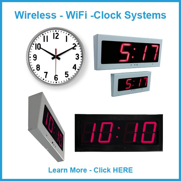 Accurate, reliable, maintenance-free clock systems are easy to install. Options include analog or LED Digital clocks. A Wi-Fi clock system is the most effective on the market today.